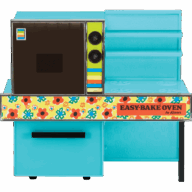 A Betty Crocker-branded oven model is released in red, turquoise, and avocado green, with faux-wood grain panels and storage cabinet. Now more than ever, kids can bake “just like Mom!” This version is powered by two 100W bulbs.